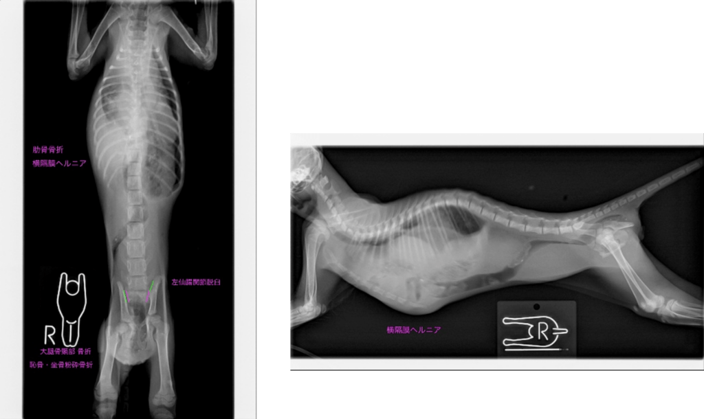 状態が少し安定したら、レントゲン検査や超音波(エコー)検査で、体のどこにどれほどのダメージがあるのか(骨折、内臓損傷、胸水、腹腔内出血など)を迅速かつ正確に評価します。