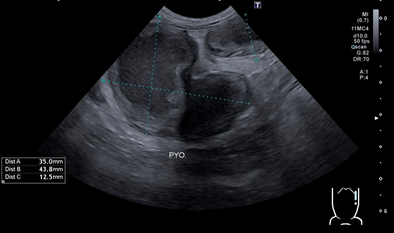 診断を確定するために最も重要な検査です。お腹に超音波を当てることで、液体(膿)でパンパンに膨れ上がった子宮を直接確認することができます。