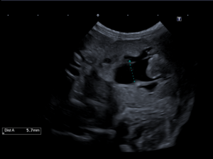 - エコー検査: 著しい尿管の拡張と腎盂の拡張。尿管径は5.7mmと、通常(1mm以下)より大きく拡張していました。