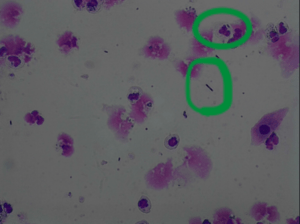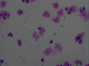 - 尿検査: 尿中に細菌と白血球、細菌の貪食像がみられました(画像参照)。
